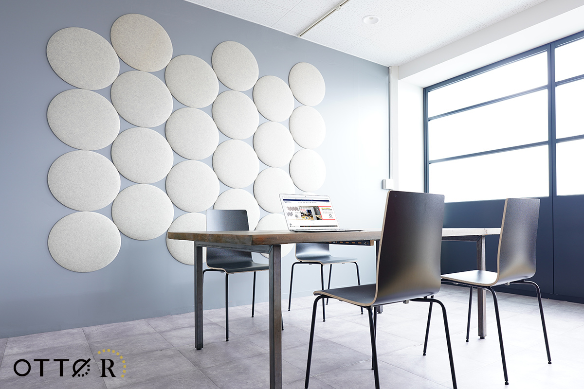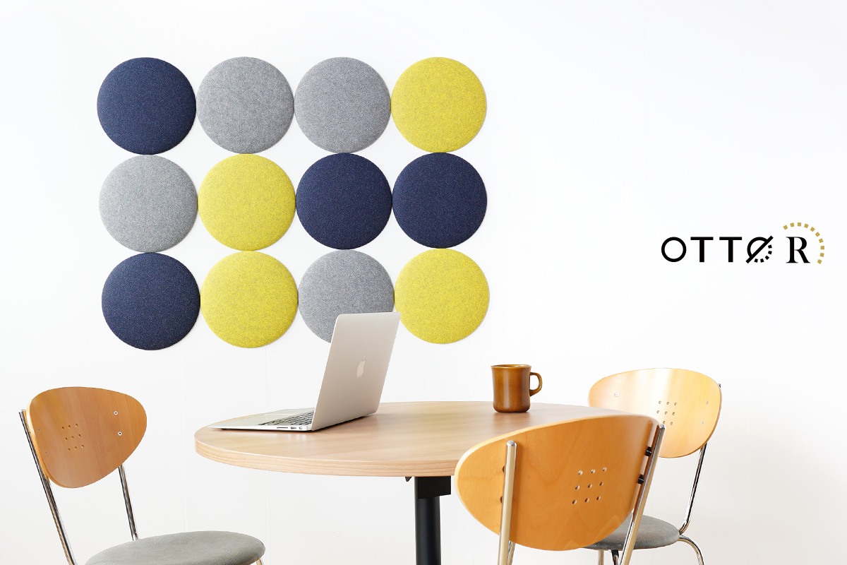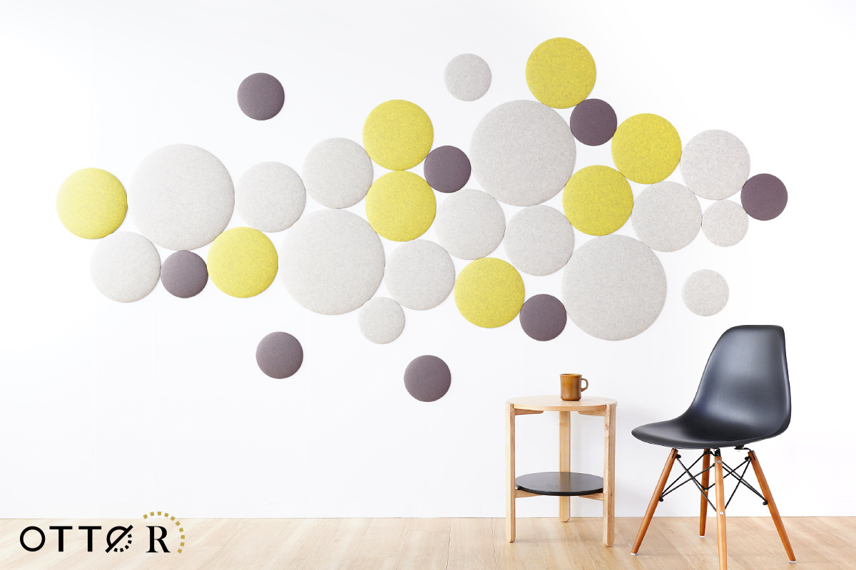 オフィス向け吸音パネル「OTTO R(オットー・アール)」は2021年6月の発売以来、豊富なカラーと手軽さが好評でオフィス以外でも保育園や大学、一般のご家庭まで幅広くご使用いただいております。既存の4種の形状に加え新たに登場する丸型は同形状で3サイズ(直径20cm、30cm、45cm)あり、大きさの異なるパネルを組み合わせることでこれまでと違ったクリエイティブなデザインが可能に。また直径20cmのパネルは一般のご家庭でも取り入れやすいサイズで、壁のちょっとしたスペースや小さなお部屋への設置にもおすすめです。設置方法は付属のマグネット、または両面テープで壁に貼り付けるだけなので、組み合わせを楽しみながら様々なシーンに合わせた快適な音環境づくりが出来ます。