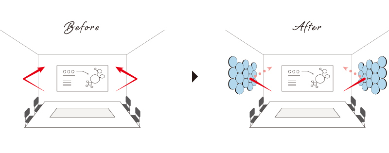 Beforeのように音は壁に当たると反射し、「声が聴き取りづらい」「ざわざわしている」等の不快感の元になりますが、OTTO R(オットー・アール)を貼ることで、壁に当たる音を吸収。反射を抑え、不快な響きを改善することができ、フロア内のざわつきやハウリング、昨今増えているWEB会議での反響音による聞き取りづらさ等、オフィスにおける音問題を解決します。