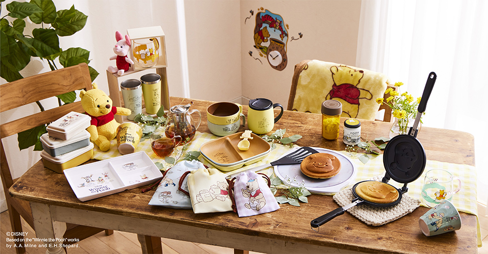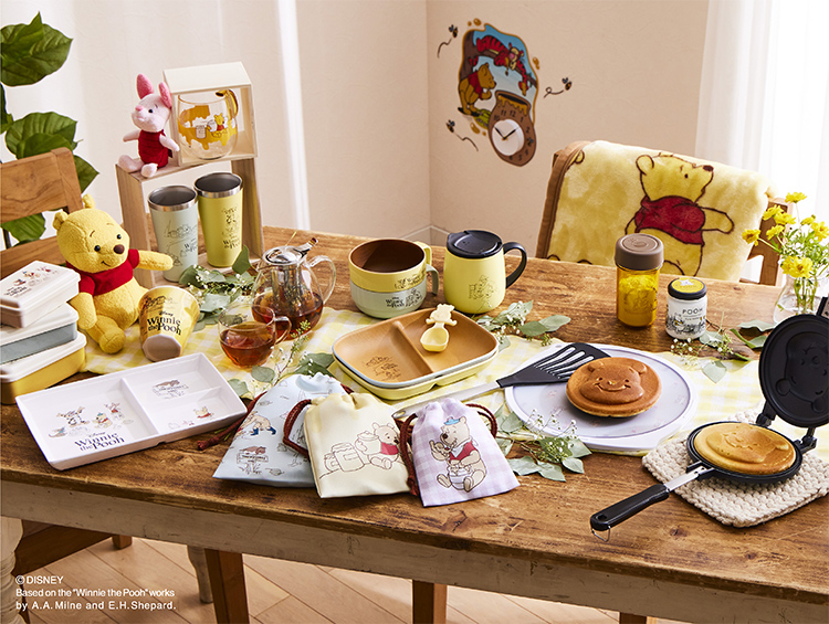 くすみブルーが印象的な「Café」をはじめ、表情豊かな「くまのプーさん」がデザインされたグッズを中心に、幅広いアイテムが勢ぞろい。