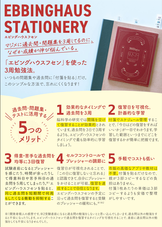 多くの勉強法の本で分散学習が推奨されています。しかし、受験生が自身で分散学習を管理することは大変です。エビングハウスフセンは分散学習を簡単に管理できるツールです。