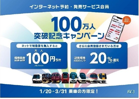 近鉄では、「インターネット予約・発売サービス」の会員数が、この度100万人を突破したことを記念して、2026年1月20日(火)から3月31日(火)まで、「インターネット予約・発売サービス」会員100万人突破記念キャンペーンを実施します。