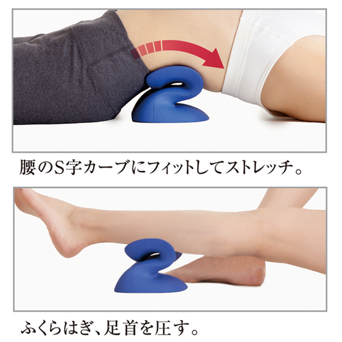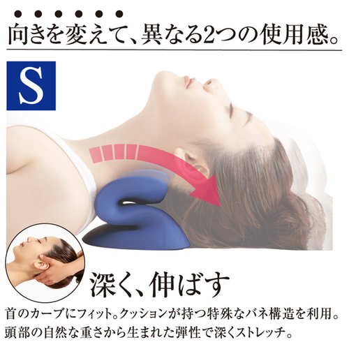 〇S字・・・深く伸ばす。首のカーブにフィット。クッションが持つ特殊なバネ構造を利用。頭部の自然な重さから生まれた弾性で深くストレッチ