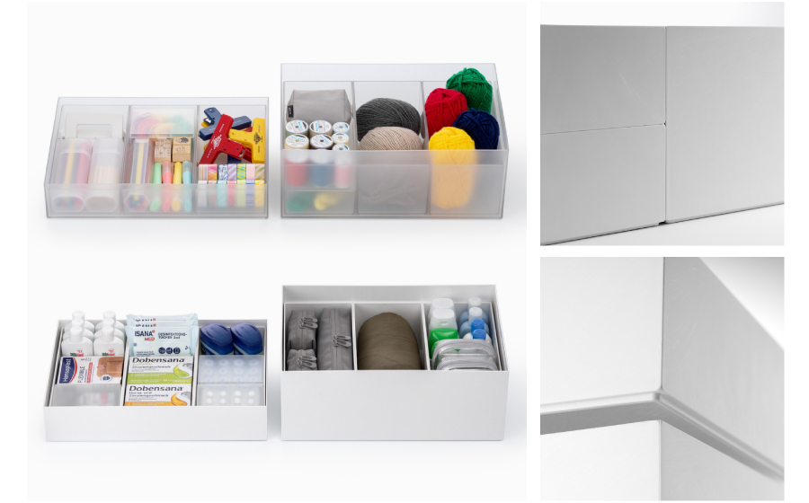 ■インナー(深型・浅型・トレー)、ボックス(深型・浅型・トレー)で組み合わせて自由に使える6型3色展開。