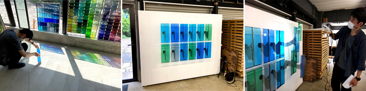 今年は、国際瀧冨士美術賞の第37期(2016年)受賞者で彫刻作家の小見 拓(こみ たく)さんに制作いただきます。金属の骨組みにステンドグラスのパネルを組み合わせた12個のパーツを、立体的に壁面に配置した彫刻作品『変形態_平面』を展示します。これまで培ってきた設計に関する技術や知識、デザインの視点を生かした、小見さんならではのオリジナリティあふれる作品となっています。
