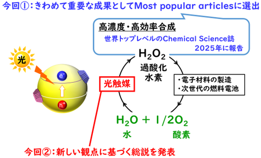 研究グループは、"Chemical Science"と同様に国際的に著名な2つの学術雑誌に、新しい観点で光が関係する過酸化水素合成について、総説を発表しました。一報は、これまでの光触媒による過酸化水素合成の歴史を振り返りつつ、光の利用効率が100%をはるかに超える最新研究について、光化学の分野での新たな位置づけを体系的にまとめた内容で、令和7年(2025年)10月に"Chemical Communications"に掲載されました。もう一報は、光電気化学プロセスによる過酸化水素合成の最新動向を網羅的に解説し、実用化に向けて効率的なシステムの設計を示した内容で、令和8年(2026年)1月に"Chemistry - A European Journal"に掲載されました。なお、"Chemistry - A European Journal"に掲載された総説は、研究グループが"Chemical Science"に発表した高効率な光触媒反応による過酸化水素合成の成果を受けて、出版社の編集者から直接執筆を依頼されたものです。