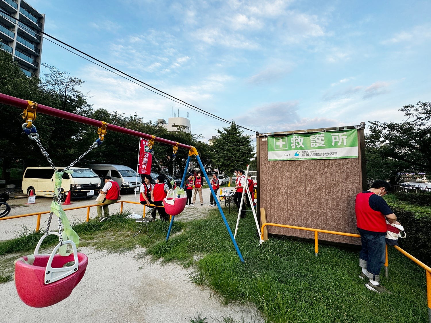 医療法人医誠会は、地域社会への貢献として天神祭の救護活動に積極的に参加しています。今回は医誠会国際総合病院から3名の医師がボランティアとして参加し、船渡御本部、源八橋下流右岸、桜ノ宮橋下流左岸の3か所の救護所で活動を行いました。救護所にはイベントナースや搬送スタッフも配置され、チームとして協力しながら対応しました。