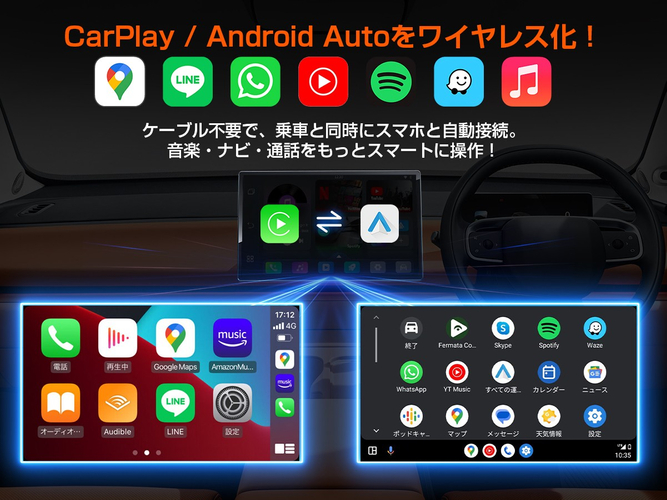 有線でしか使えなかったCarPlay/Android Autoをワイヤレス化。一度ペアリングすれば、エンジンをかけるだけで自動接続。
