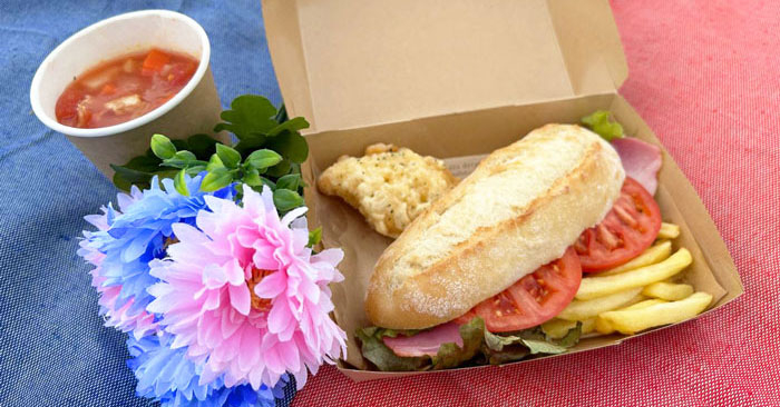ミネストローネとヘミングウェイ大阪特製のBLTサンドがセットになった軽食、イスやレジャーシートの貸し出しも行っておりますので、お花見のためにご自身で準備をする手間がありません!