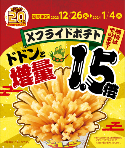 みなさまに愛されて 販売20周年‼ Xフライドポテト 1.5倍増量 2023年12月26日(火)より10日間限定