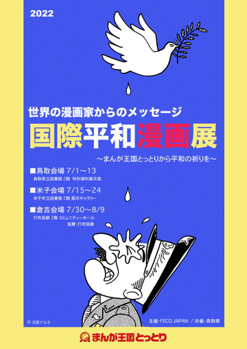 世界漫画家連盟日本支部(FECO JAPAN)の会長であり京都精華大学名誉教授でもある篠原ユキオ氏と、同じくFECO JAPANメンバーの横田吉昭氏の呼びかけによって集まった、海外と日本の漫画家たちによる、反戦と平和をテーマとするヒトコマ漫画を紹介する展示を、鳥取県内3つの会場で開催します。