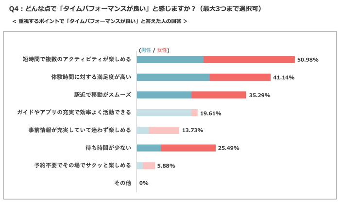 「コスパが良い」は価格と満足度のバランスが明確ですが「タイパが良い」と感じる基準は人によって異なります。具体的に尋ねると「短時間で複数のアクティビティが楽しめる」が最多となり、効率よく多くの体験ができることを重視していると判明。次いで「体験時間に対する満足度が高い」「駅近で移動がスムーズ」が挙がり、所要時間に対する充実感やアクセスの良さも重要な要素であることがわかりました。