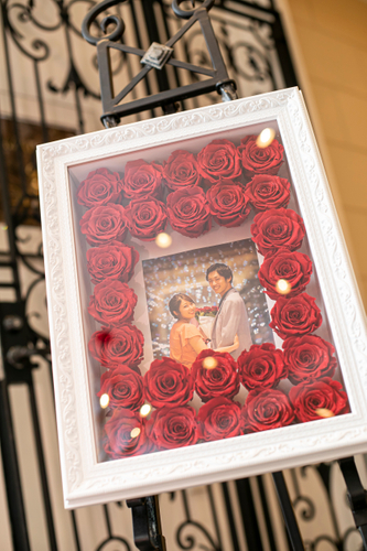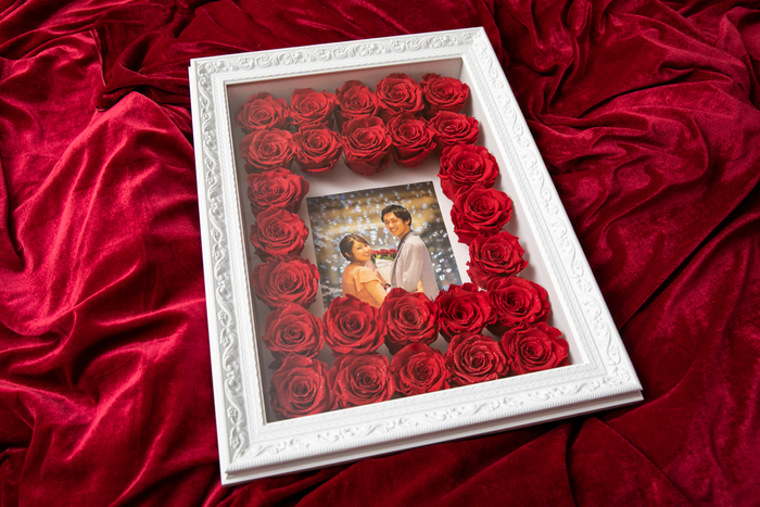 「 Dramatic Frame- ドラマティック フレーム - 」は、希少な天然ダイヤモンド入りラメを花びらに施し、深紅のベルベットのような質感が美しい“ダイヤモンドローズ”を、フローリストがひとつひとつ丁寧に敷き詰めて完成させるオーダーメイドフレーム商品。うっとりするようなローズフレームの中央に、プロポーズの瞬間の写真を収めました。