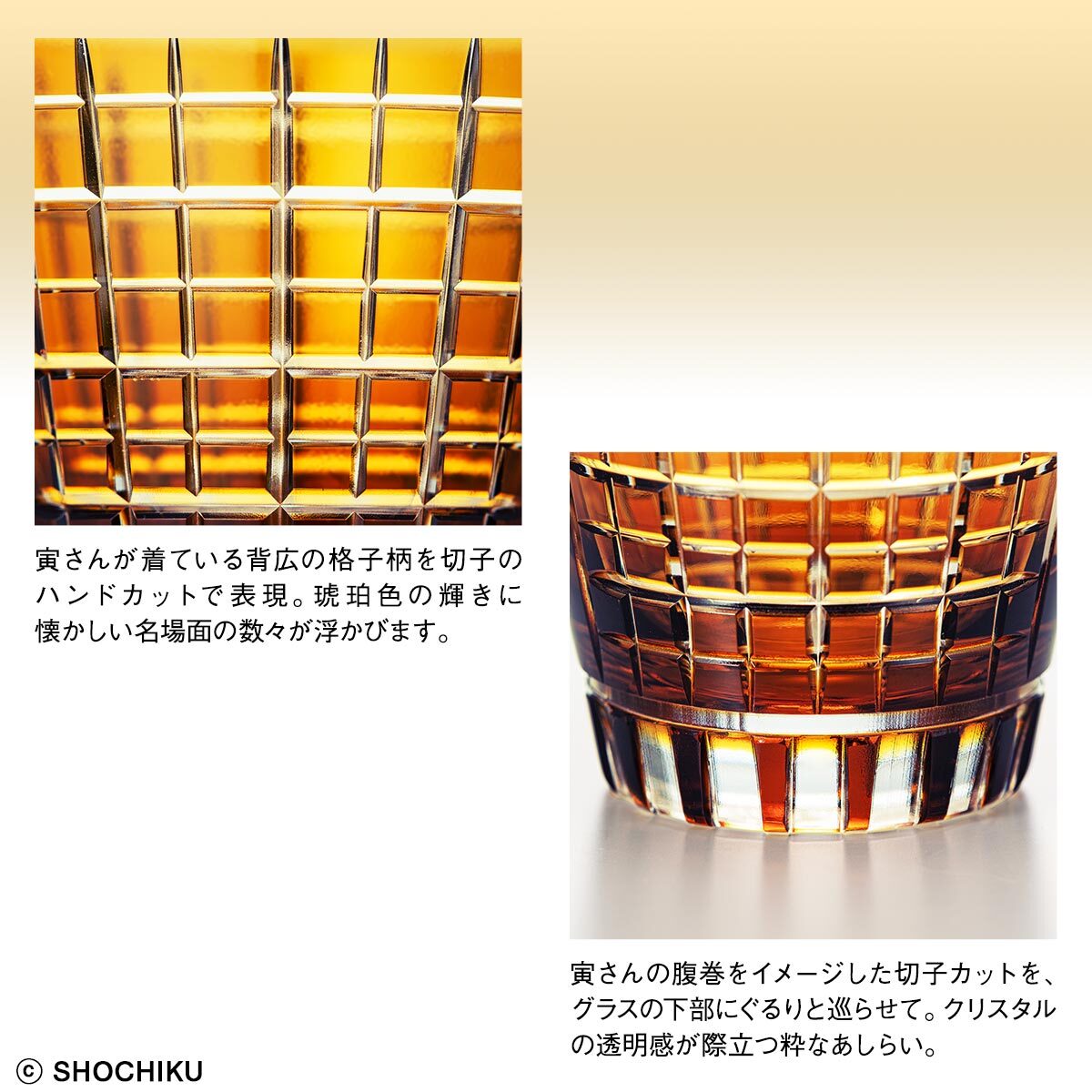 ■古き良き昭和のノスタルジーをかきたてる琥珀色の輝きに、伝統の切子カットで刻まれた格子柄は、寅さんのくだけた背広姿のイメージ。