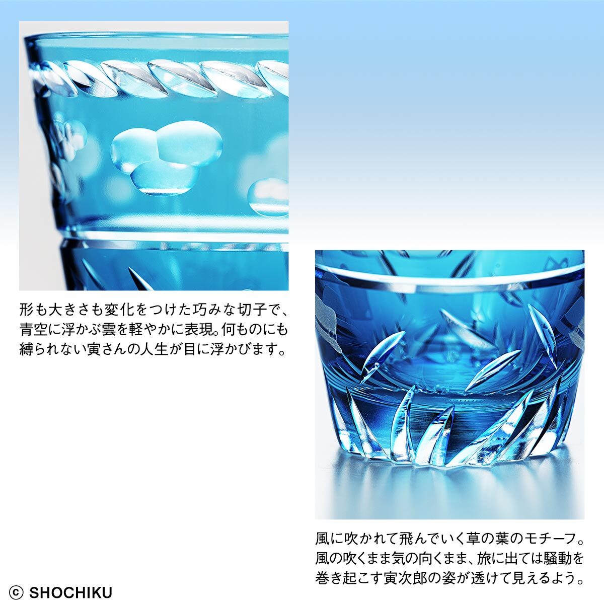 ■澄みきったブルーの色被せガラスに広がるのは、青空にぽっかり浮かんだ雲を眺める寅さんの風のように自由気ままな人生。