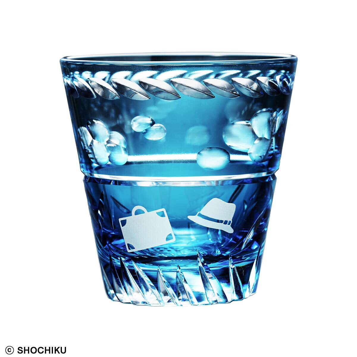 ねじり鉢巻や風に揺れる草の葉のモチーフが、白い雲とともに高度な切子カットでぐるりと刻まれ、おなじみの帽子とトランクも、サンドブラストで浮かび上がります。
