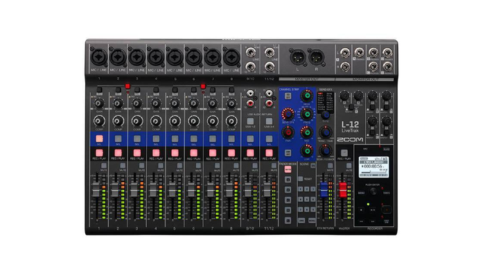 「ZOOM LiveTrak L-12」は直感的なアナログ操作の感覚を残しながらも、デジタルの利便性を詰め込んだ12チャンネル(モノラル8+ステレオ2)のライブミキサー兼マルチトラックレコーダーです。