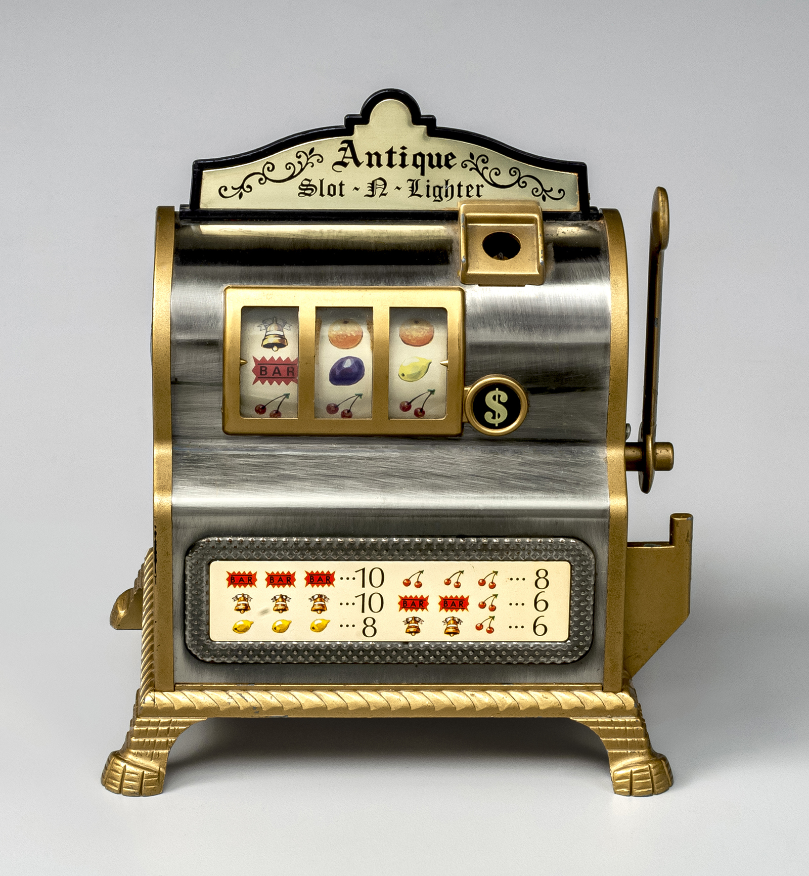 レバーを倒すとスロットが回り、右上の穴から火が出る。