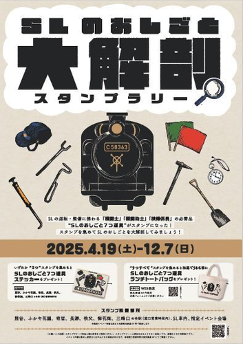 秩父鉄道株式会社(本社:埼玉県熊谷市、代表取締役社長:牧野 英伸)では、2025年のSLパレオエクスプレス運行期間に合わせて、「SLのおしごと大解剖スタンプラリー」を開催します。実際に「SL機関士」「SL機関助士」「SL検修係員」が使用する「SLのおしごと7つ道具」をスタンプにし、スタンプを集めながらSLの仕組みや整備作業等について知ることができるスタンプラリーです。