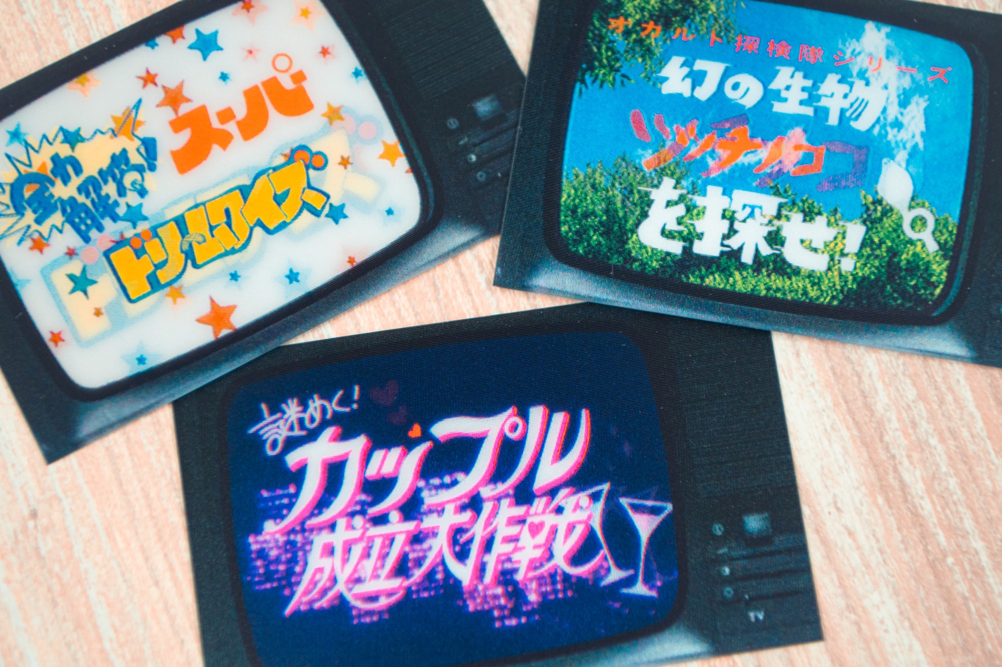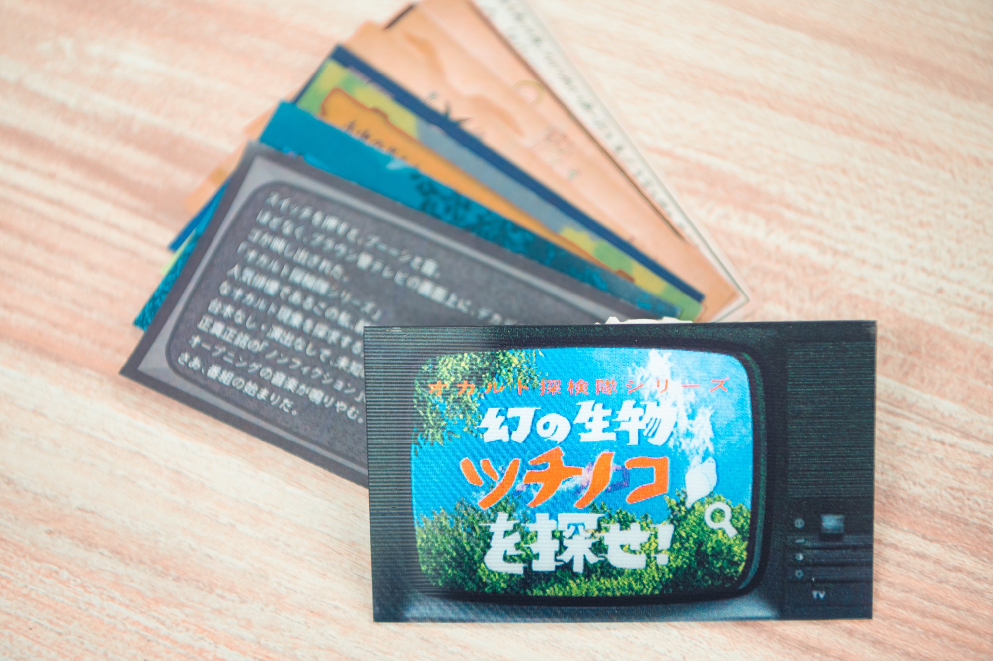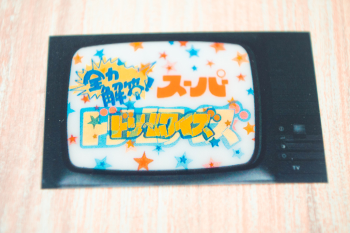 また、番組タイトルは角度により絵柄が変化する名刺サイズのシールとなっており、遊んだ後もスマホカバーや手帳に貼って思い出として残すことができます。さらに、3商品をセット購入すると手に入る収納ケースは、レトロなブラウン管デザイン。番組タイトルをセットすると、まるでテレビ画面に映し出されるかのように商品を飾ることができます。