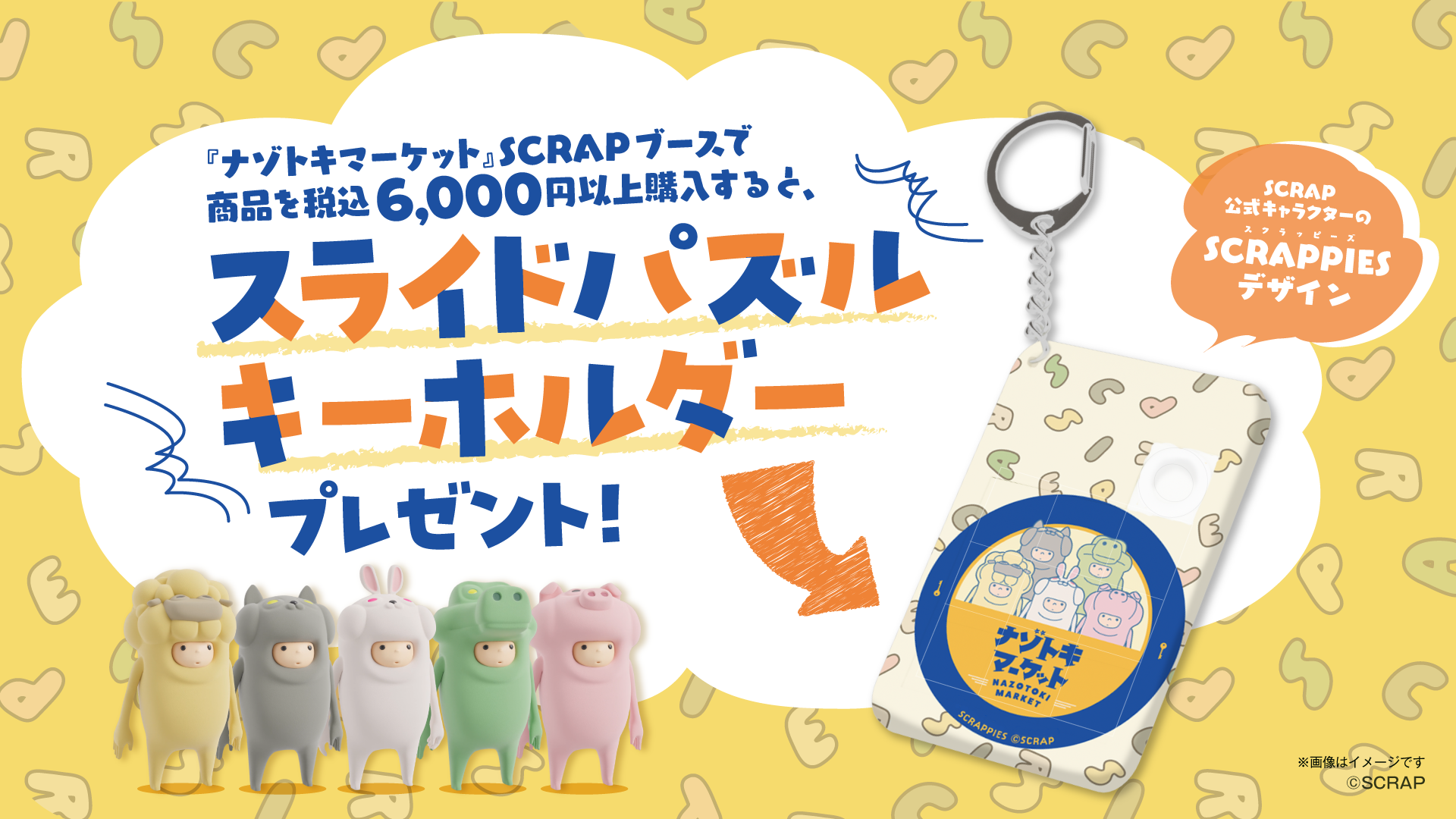 また、『ナゾトキマーケット』SCRAPブースにて本商品に限らず税込6,000円以上購入した方には、SCRAP公式キャラクターであるSCRAPPIES(スクラッピーズ)がデザインされた、スライドパズルキーホルダーをプレゼント。ここでしか手に入らない限定グッズです。