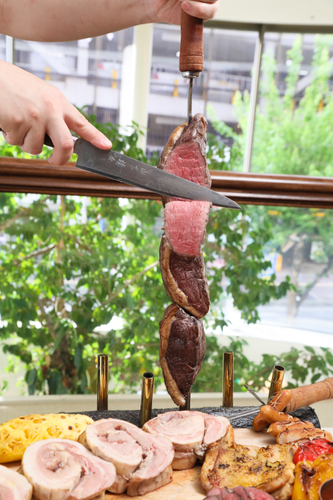牛をメインに、豚、鶏などのブロック肉やソーセージなどを1メートルほどの長い串に刺し、自慢の薪窯で焼きあげます。「ブラジル風バーベキュー」と紹介されることもあります。