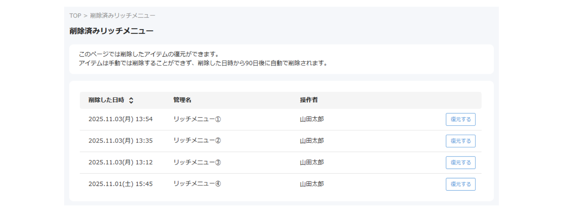これまでは、削除操作を行うと即座に完全削除されていましたが、 本機能の追加により、削除後も90日間は復元可能な状態で保管されるようになりました。 なお、保管期間を過ぎたリッチメニューは自動的に完全削除されます