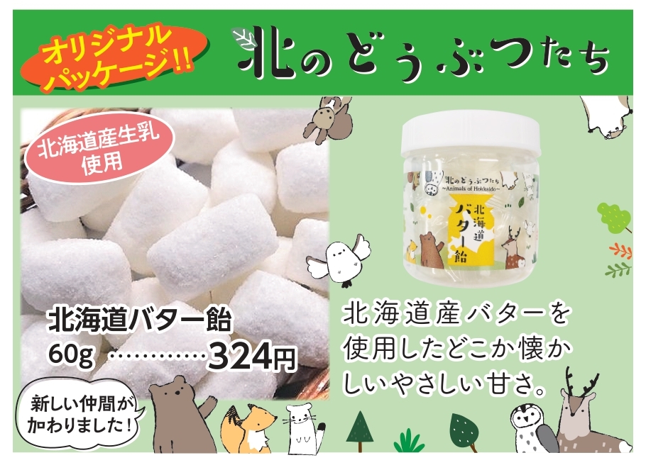 “北のどうぶつたちシリーズ”を始め、秋の味覚であるじゃがいもやかぼちゃ、秋鮭、季節限定品なども多数取り揃えております。お近くへお越しの際はお立ち寄りください。