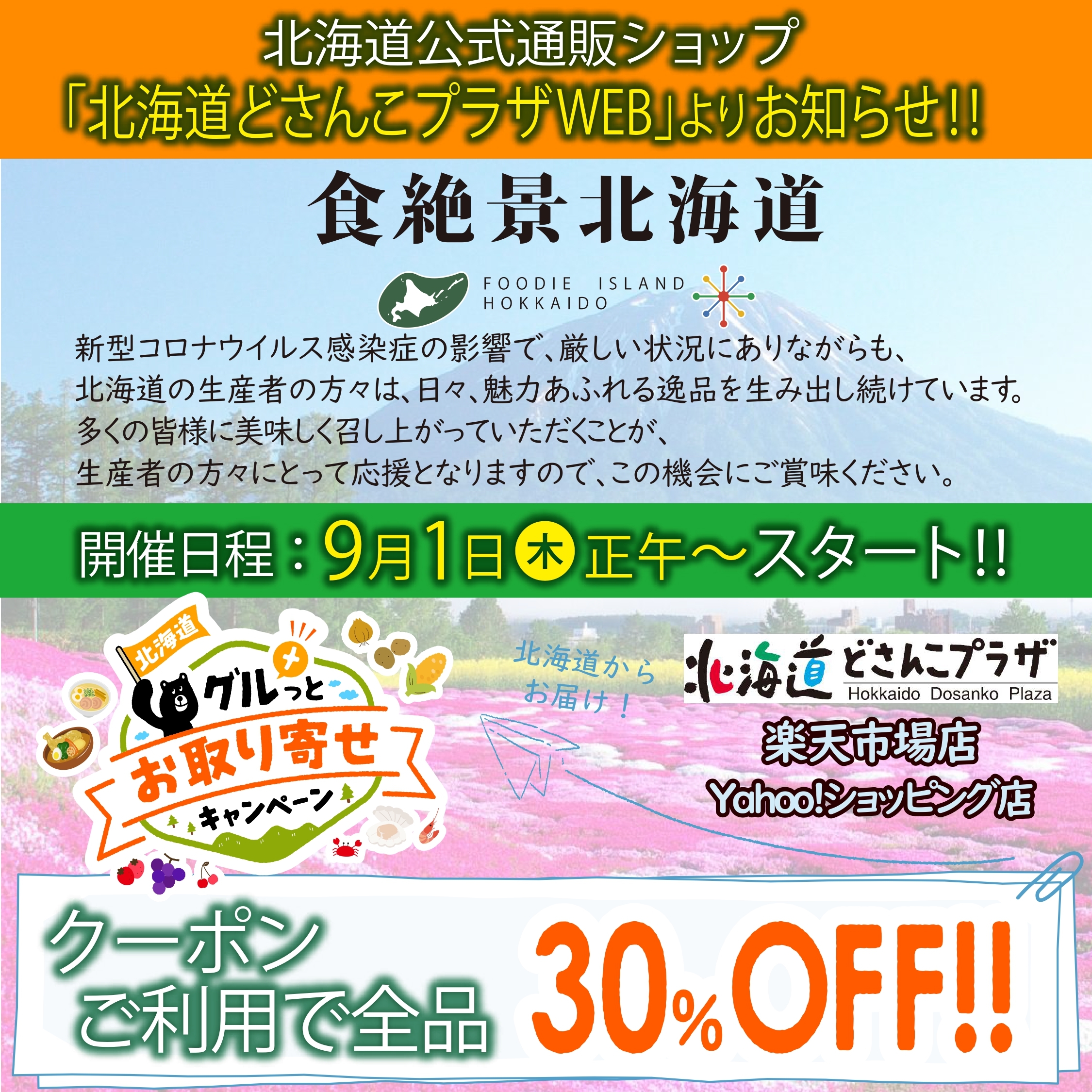北海道どさんこプラザWEB(楽天市場店・Yahoo!ショッピング)にて全商品30%OFFクーポンを配布中。