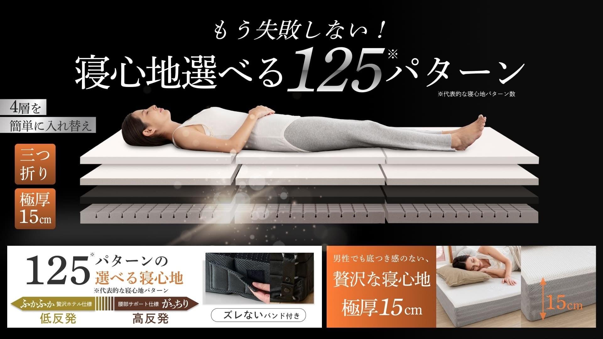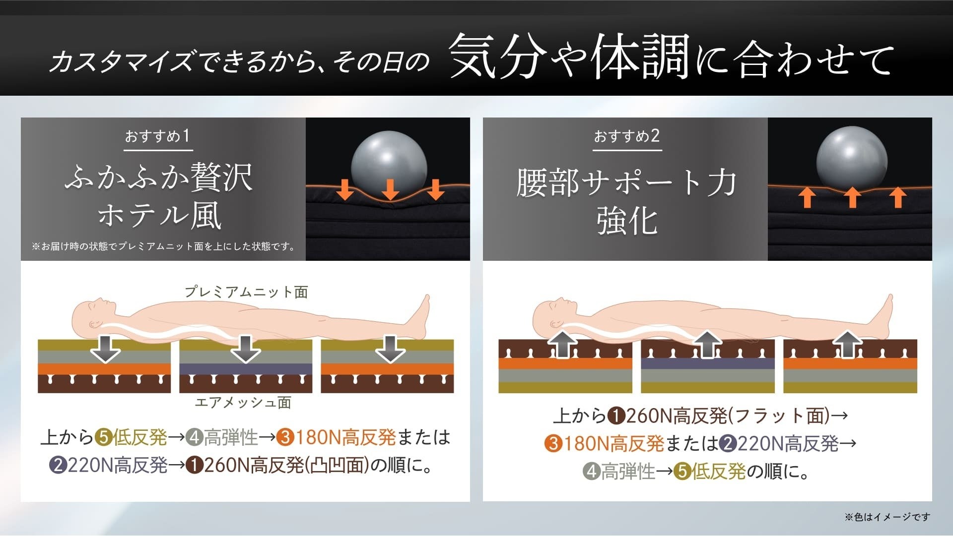 高反発260N・180N(腰部分のみ220N)・高弾性・低反発の4層構造を組み合わせることで、多様なニーズに応じた最適な寝心地を実現。125通りの組み合わせから、体格やコンディションに合わせた専用の寝心地を提供します。異なる体格やコンディションの方が共用する場合にも対応します。