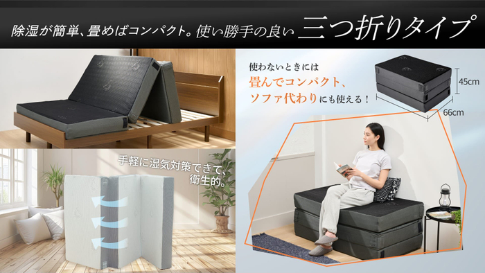 三つ折り構造により、省スペースでの収納が可能です。自立性に優れ、立てかけるだけで通気を促すため、手軽に除湿対策が行えます。未使用時はソファ代わりとしても活用でき、限られた居住空間にも柔軟に対応。衛生性と機能性を兼ね備えた、現代の住環境に適した設計です。