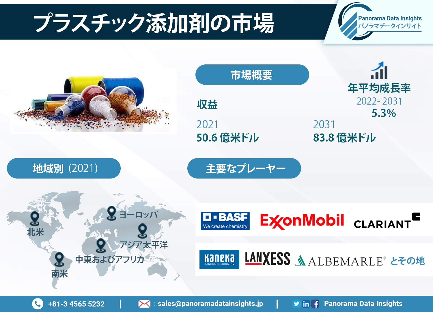 レポートの説明を参照してください- https://www.panoramadatainsights.jp/industry-report/plastic-additives-market