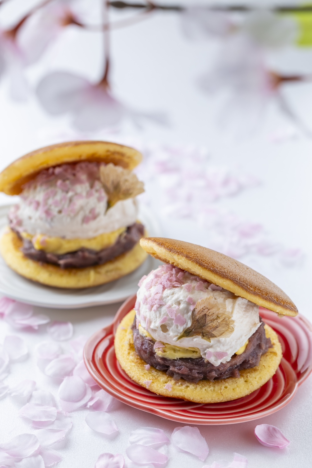 又一庵の粒あんに桜餡を合わせ、バターと桜のふわふわホイップクリーム、さらに桜の花を一輪のせました。隠し味に加えたいちごの甘酸っぱさが桜の風味を引き立てます。春の訪れを味わい楽しむ華やかな一品です。