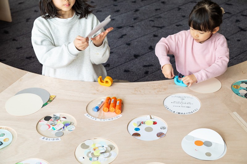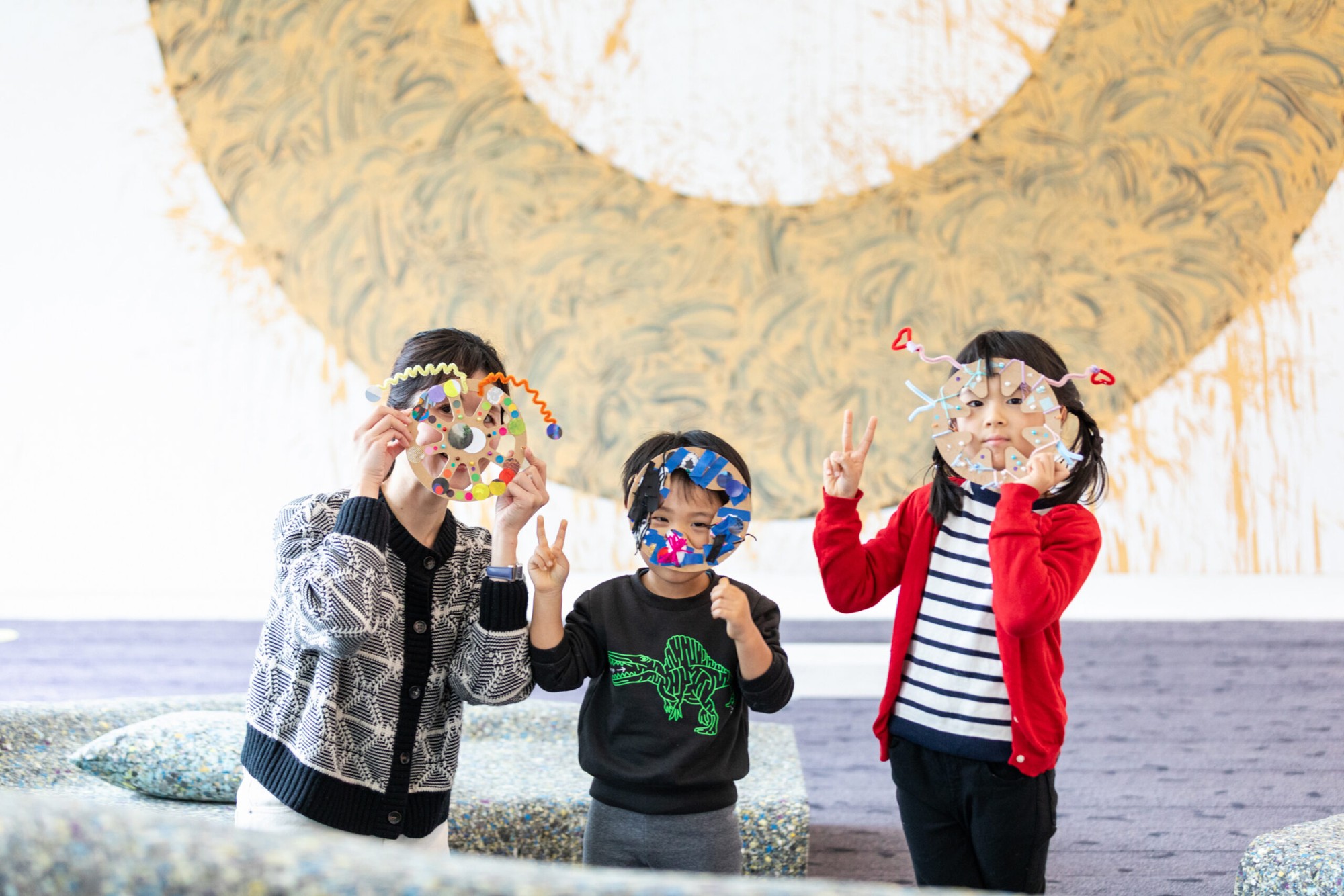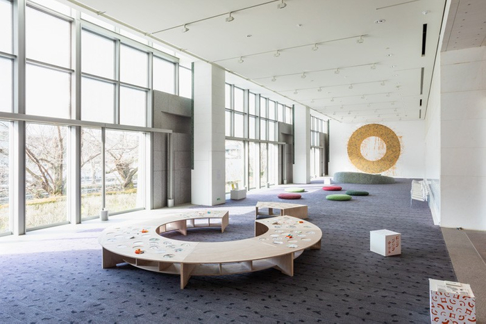 美術館の1階ロビーに、お子さんと保護者の方がリラックスしてくつろいだり、大きな作品との出会いを楽しめるようなソファやテーブル、自分だけのお面が作れるコーナー、美術館のなかを探検できるアクティビティなどが登場します。