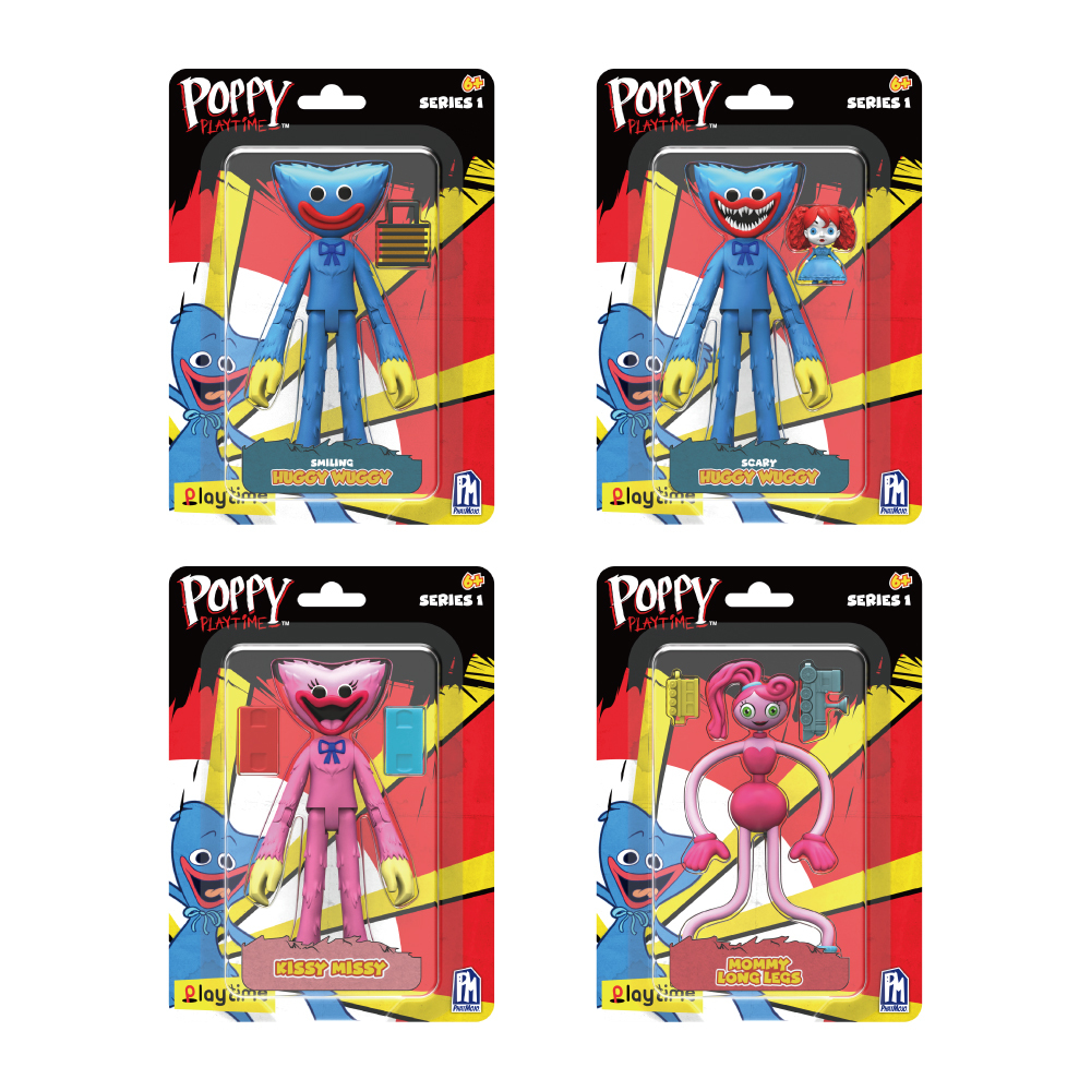 Poppy Playtimeで人気の「Huggy Wuggy」「Kissy Missy」「Mommy Long Legs」のフィギュアです。「Huggy Wuggy」はかわいい笑顔の(スマイル)と、プレイヤーを追いかける姿が印象的なこわかわいい(ホラー)の2種で登場。顔や手足を動かすことができ、またそれぞれ付属されている小物も持たせることができます。