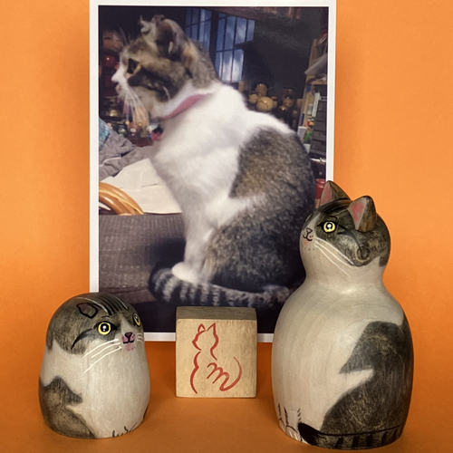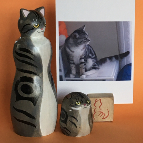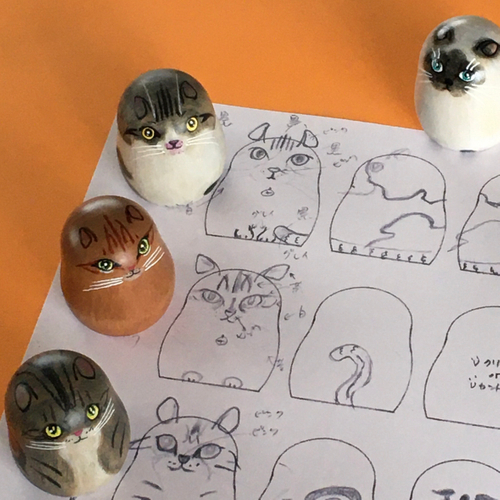 これまでの購入者にお願いして小型と中型のモデル犬が見つかり、やり取りを始めてみたところ、犬専用の体形が必要であると気づき、サイズ別に揃える決意をしました。猫の平面顔に対して犬の顔は立体的、さら犬種ごとに体の大きさが違う、耳の形もいろいろあることから猫形こけし人形の体型では対応できず、1から開発することになりました。これまでにないユニークな形のこけしにしたいと考えています。