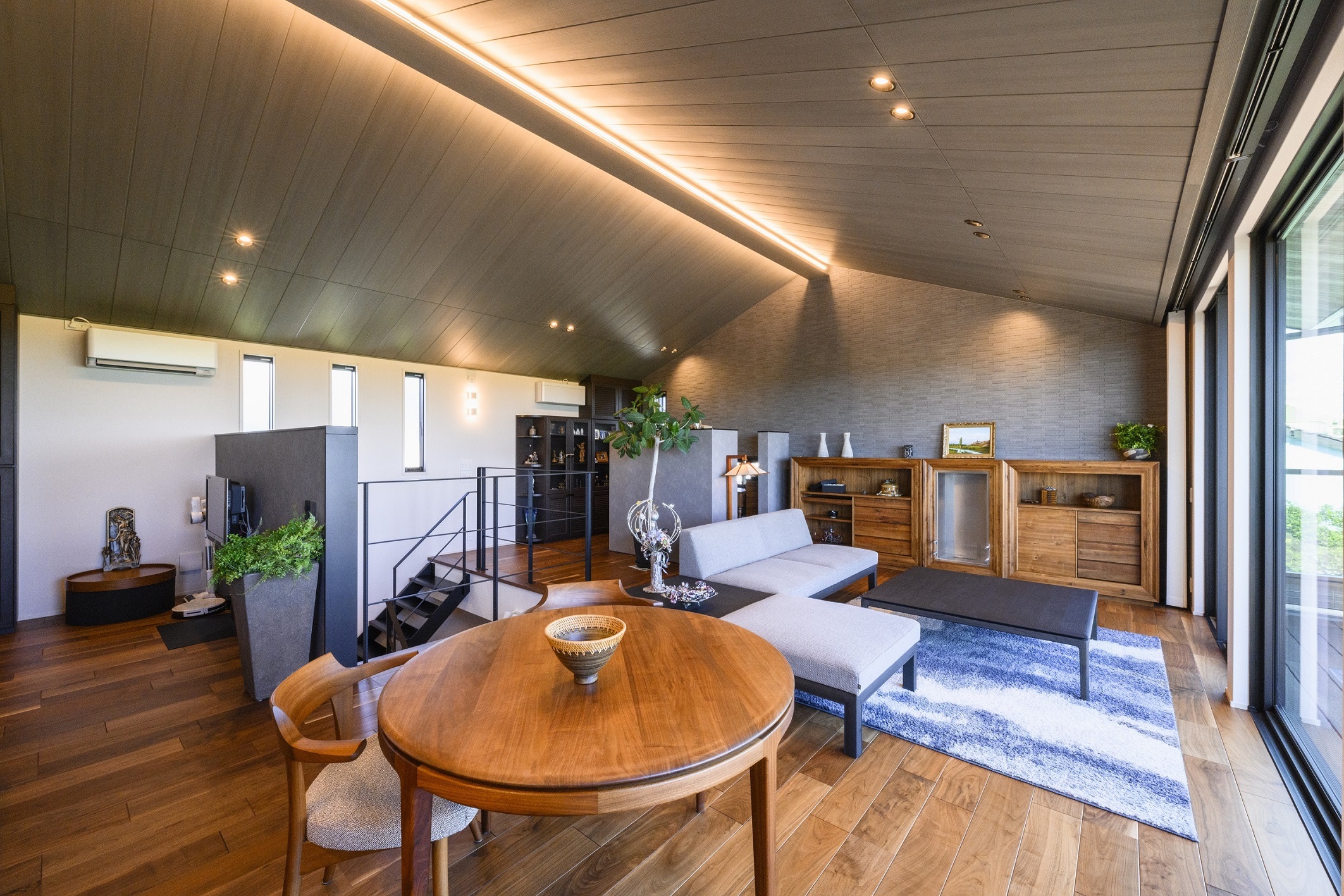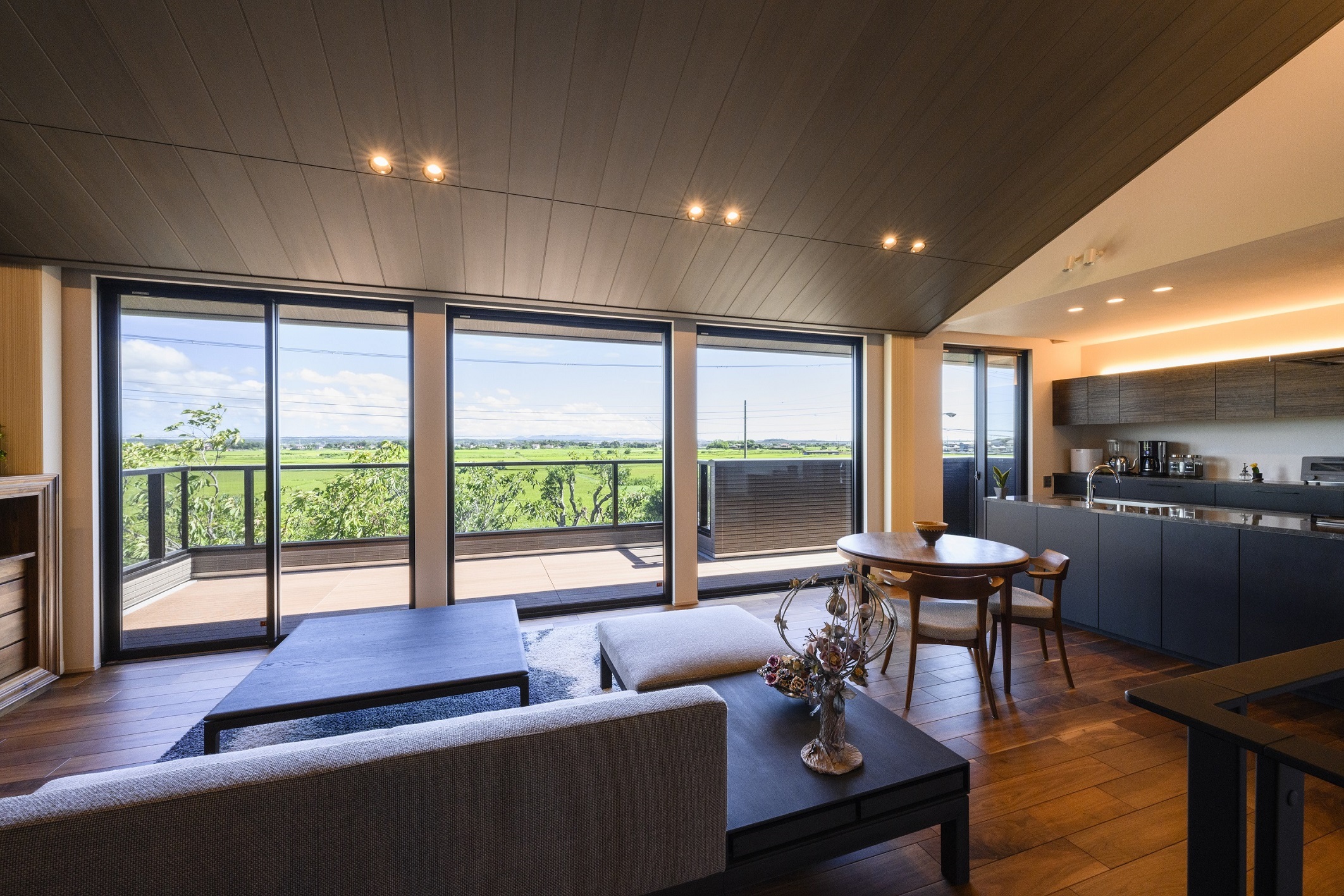 広さにこだわったリビングは、眺望を生かすために2階に。勾配天井を活かした3.7mの天井高と梁や柱のない開放的な空間、そして高さ2.5m、幅約8mの全面開放の窓の先には、青々とした田畑と山並みが絵のように広がります。