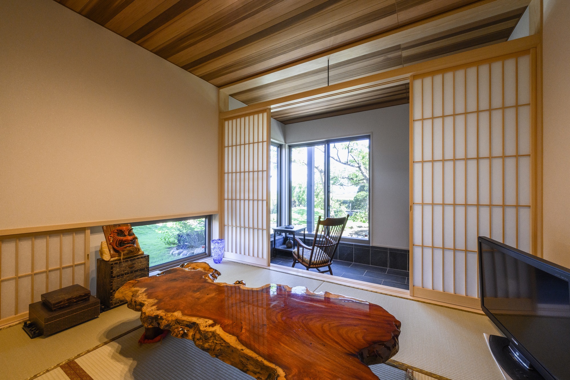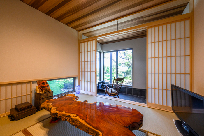 「正直、広い空間ができるなら軽量鉄骨でも鉄筋コンクリートでもかまわないと思っていました。しかし展示場を見て、和モダンの木の重厚さと天井高3m以上の広さに感激。木造なら周囲の景観ともマッチすると即決しました。」(夫・Jさん)