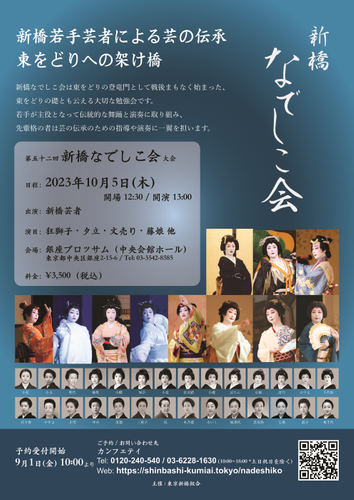 東京新橋組合主催、『第五十二回 新橋なでしこ会』が2023年10月5日 (木)に銀座ブロッサム(中央会館ホール)(東京都中央区銀座2-15-6)にて開催されます。チケットはカンフェティ(運営:ロングランプランニング株式会社、東京都新宿区、代表取締役:榑松 大剛)にて9月1日(金)10:00より発売開始です。