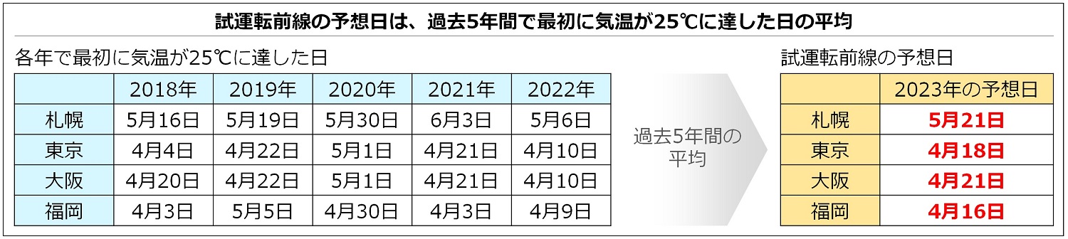本前線に記載の予想日は、全国の各地域の過去5年間において、各年の最高気温が25℃に達した最初の日を調査し、それらを平均した日としています。