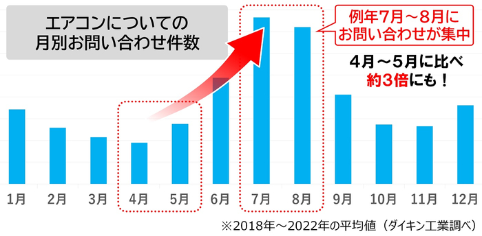 例年、エアコンのお問い合わせや点検のご依頼は、エアコンを使い始める6月頃から増え始め、7月、8月 に集中します。混雑により暑い時期に修理対応をお待ちいただく場合があるため、本格的に暑くなる前の4月~6月前半に試運転を行い、早めに準備を済ませていただくことをご提案しています。