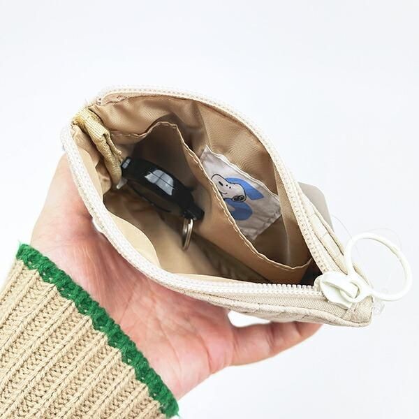 スヌーピーのパスケースを裏側から見ると、このような感じに。パスケースをさっと入れられそうですね。付属のコイルストラップは伸縮性があるので、鞄に付けて気軽に使えるのも嬉しい。