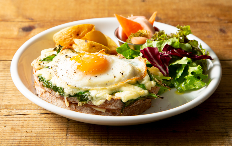西東京市の矢ケ崎農園で大切に育てられたルッコラを使って仕上げたクロックマダムは、目玉焼きをプチっと割れば、とろっと濃厚な黄身が溢れ出し、サンドしたハムの塩気とチーズとのハーモニーをご堪能いただけます。太陽の光が降り注ぐ朝、テラス席でコーヒーと合わせていかがでしょうか。