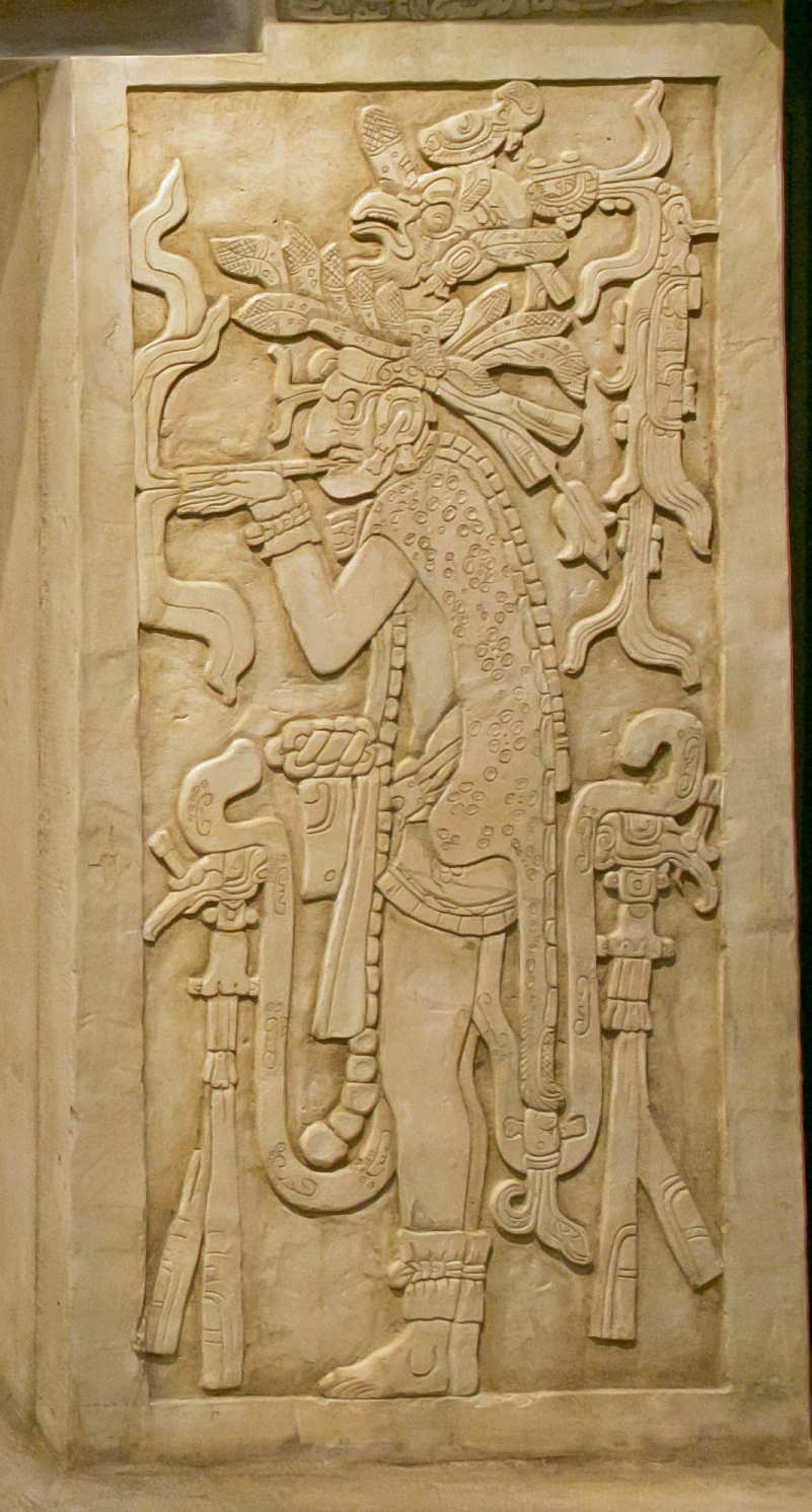 マヤ文明が繁栄したこの地方では、葉巻、あるいはトウモロコシの皮などでたばこの葉を包んだ、紙巻たばこのような形状でのたばこの使用が主流だったと考えられています。その様子は、絵文書や出土した土器にも描かれています。また、現在のメキシコ南部チアパス州に位置するパレンケ遺跡には、当時の人々がけむりを用いていたことがわかる資料が残されています。マヤの神話である『ポポル・ヴフ』にもたばこや香が登場しており、これらがこの地方において重要な役割を担っていたと考えられます。