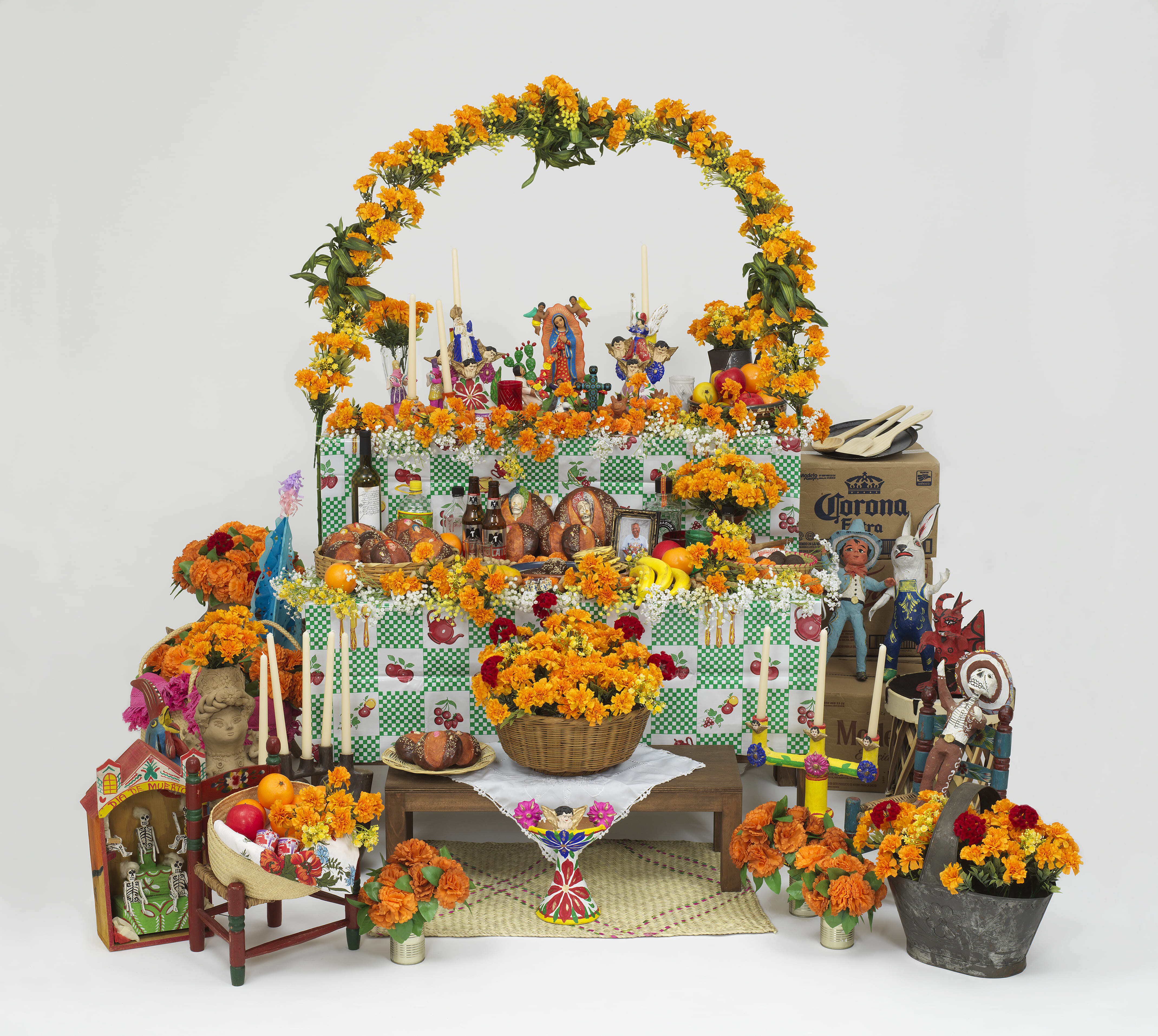 死者の日は、古代から続く土着の信仰とキリスト教カトリック教会の万聖暦が結びついたもので、死者の魂が現世に帰ってくる日とされます。メキシコでは、死者の日には各家庭で祭壇をつくり、センパスチトルと呼ばれるマリーゴールドで飾られた花のアーチをつけます。このアーチは現世の入り口となり、死者はこのアーチをくぐって帰ってくると考えられています。生者は死者に対して十二分に供物をささげ、祖先に家族の幸せを祈願します。