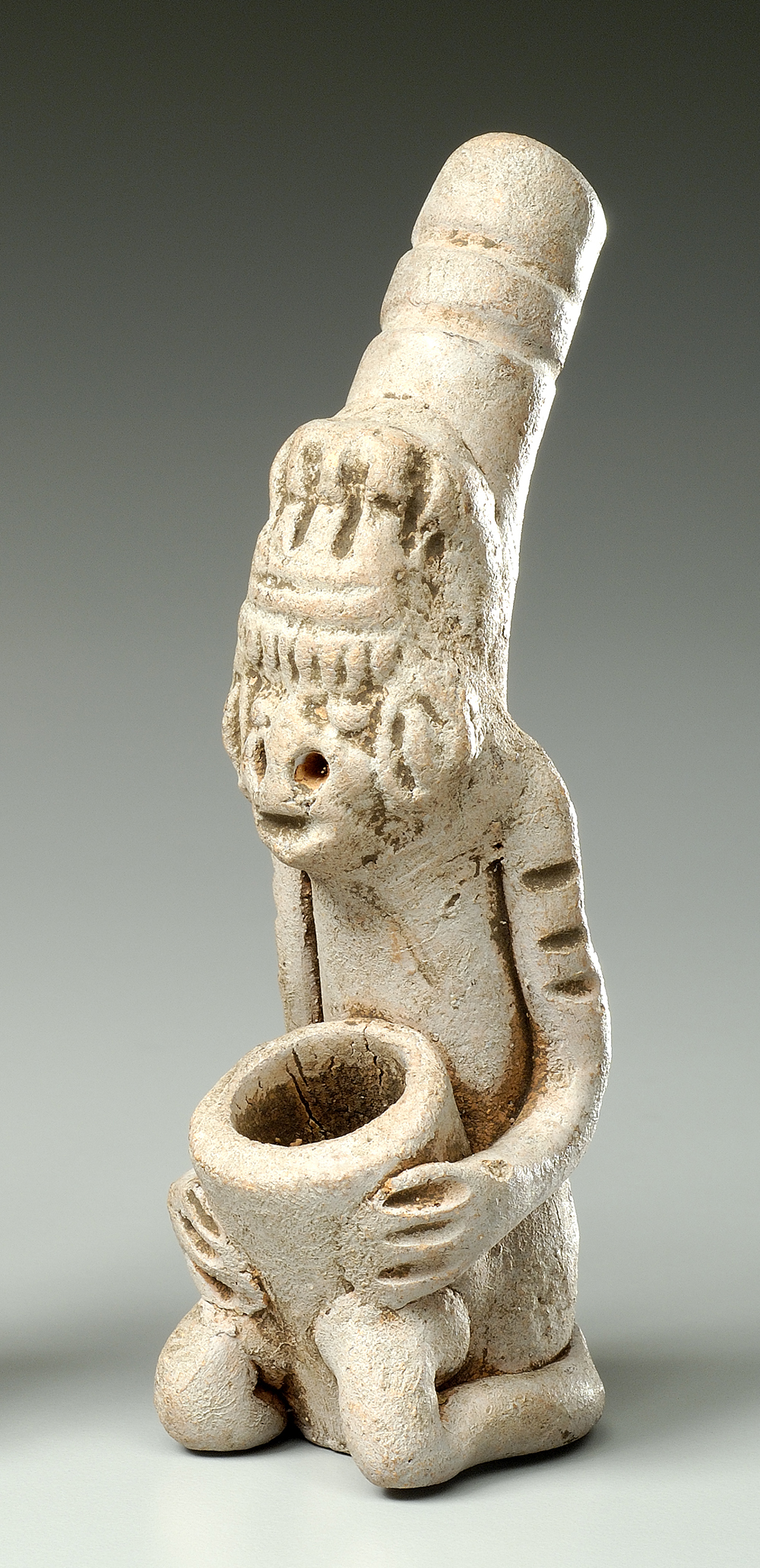 背面に円筒がついていて、香炉として作られたと考えられる。雨や稲妻を司るコシーオという神が象られている。
