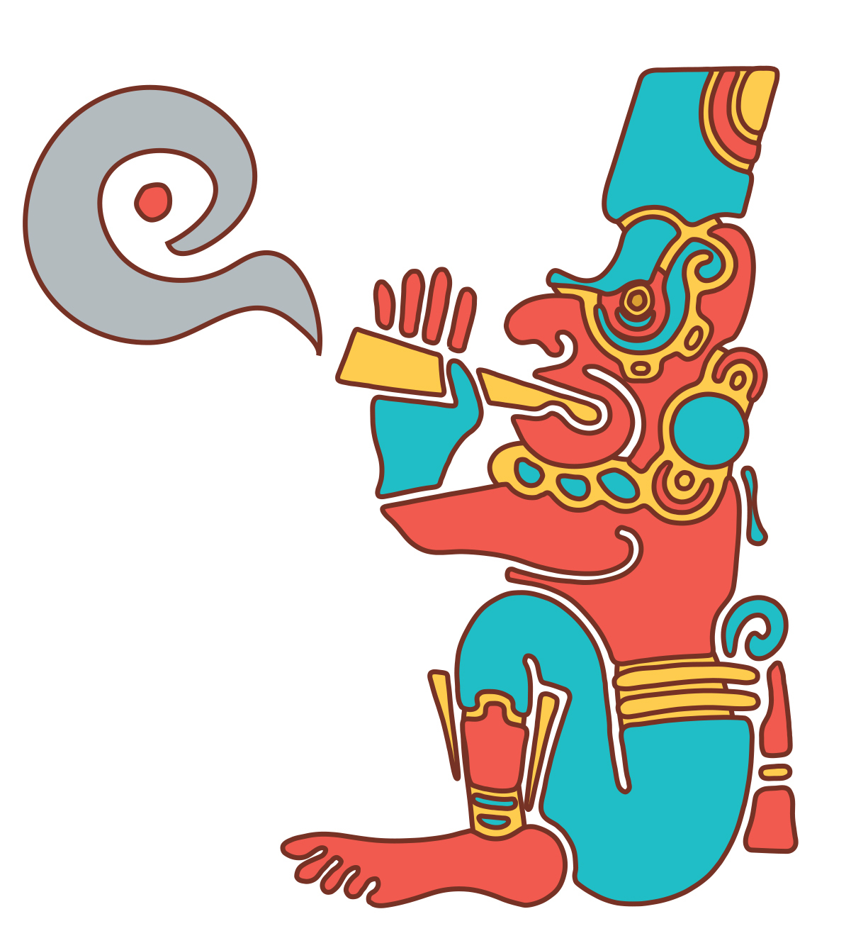 たばこをふかす神様は、絵文書などの資料に度々登場する。本展のサポートキャラクターであるたばこをふかす神は、当館のロゴをアレンジしたもので、『マドリード絵文書』に描かれた神が元になっている。