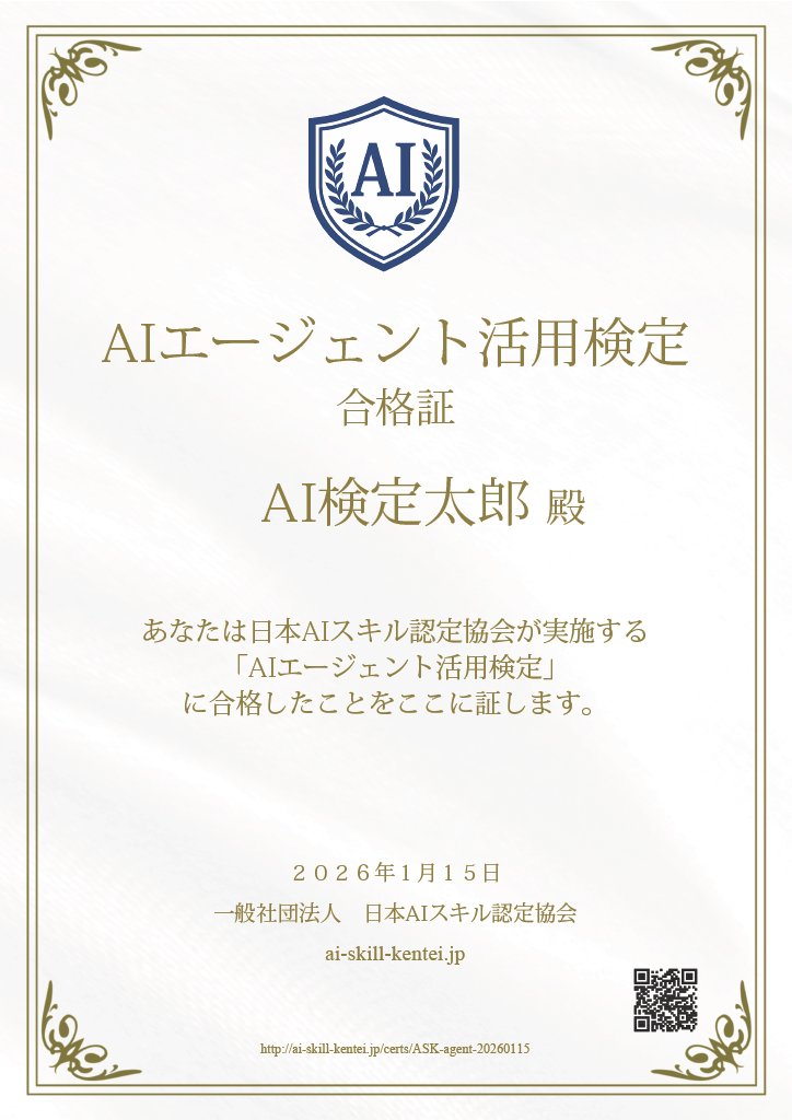 一般社団法人日本AIスキル認定協会(東京都渋谷区)は、無料AI資格「AIエージェント活用検定」を2026年1月16日より提供開始いたします。