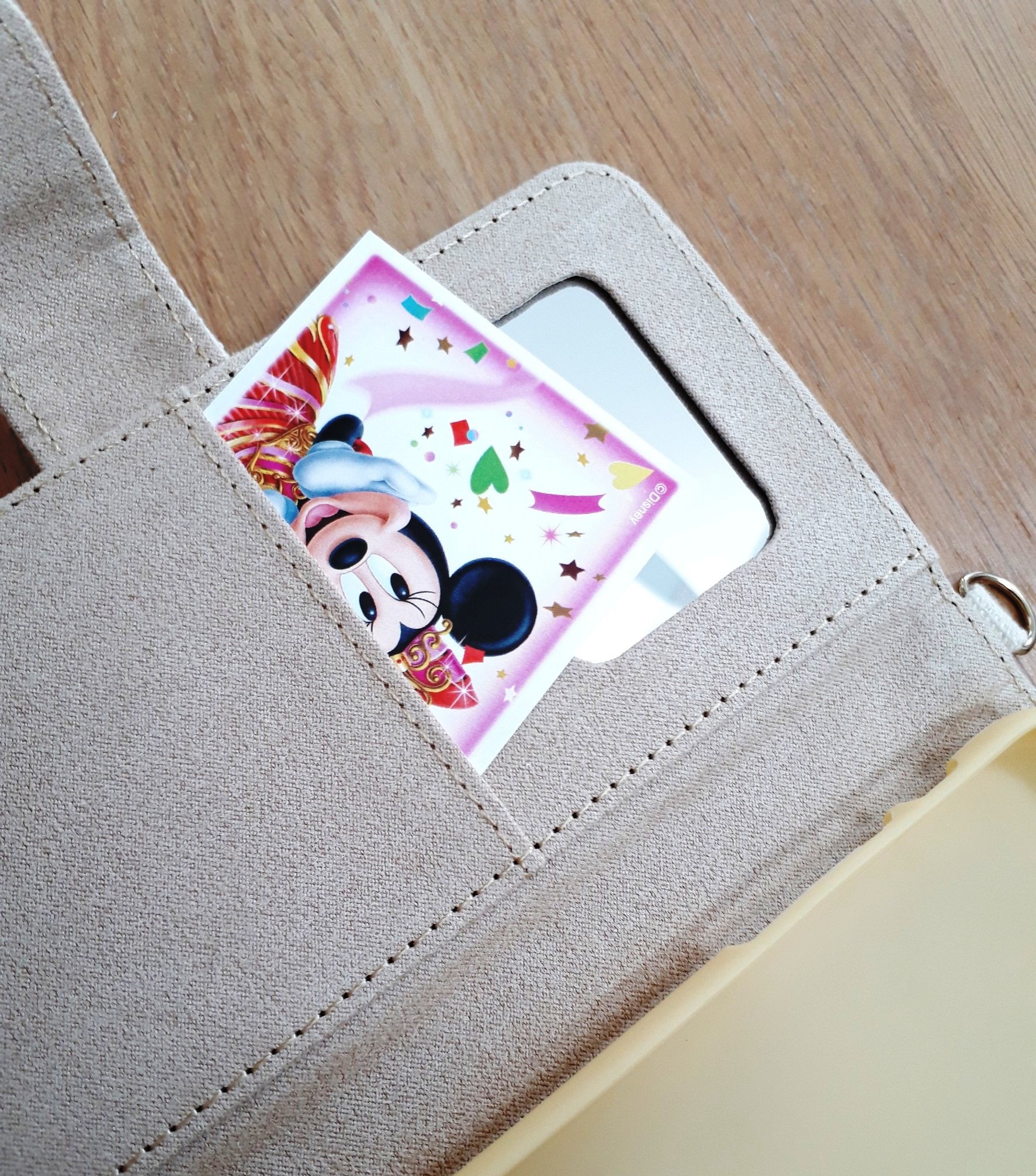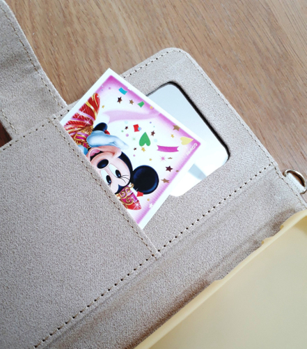 扉側には、もう一つうれしい機能が…定期はもちろん!ディズニーランドのパスポートも入れられちゃうポケット付きなんです。これでパストパスを取る時もストレスなく、パスポートを出せちゃいますね。