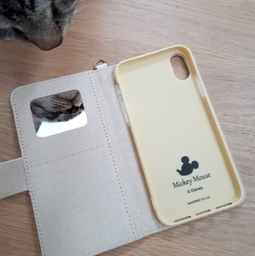 内側はこんな感じ。スマホをはめ込む箇所にはミッキーのシルエットが。スマホをはめるのがもったいない!!扉側には、女性にはうれしいミラーがついています。いざという時、さっと出せるミラーってとっても重要ですよね。(うちのにゃんこが映り込んでおります…)