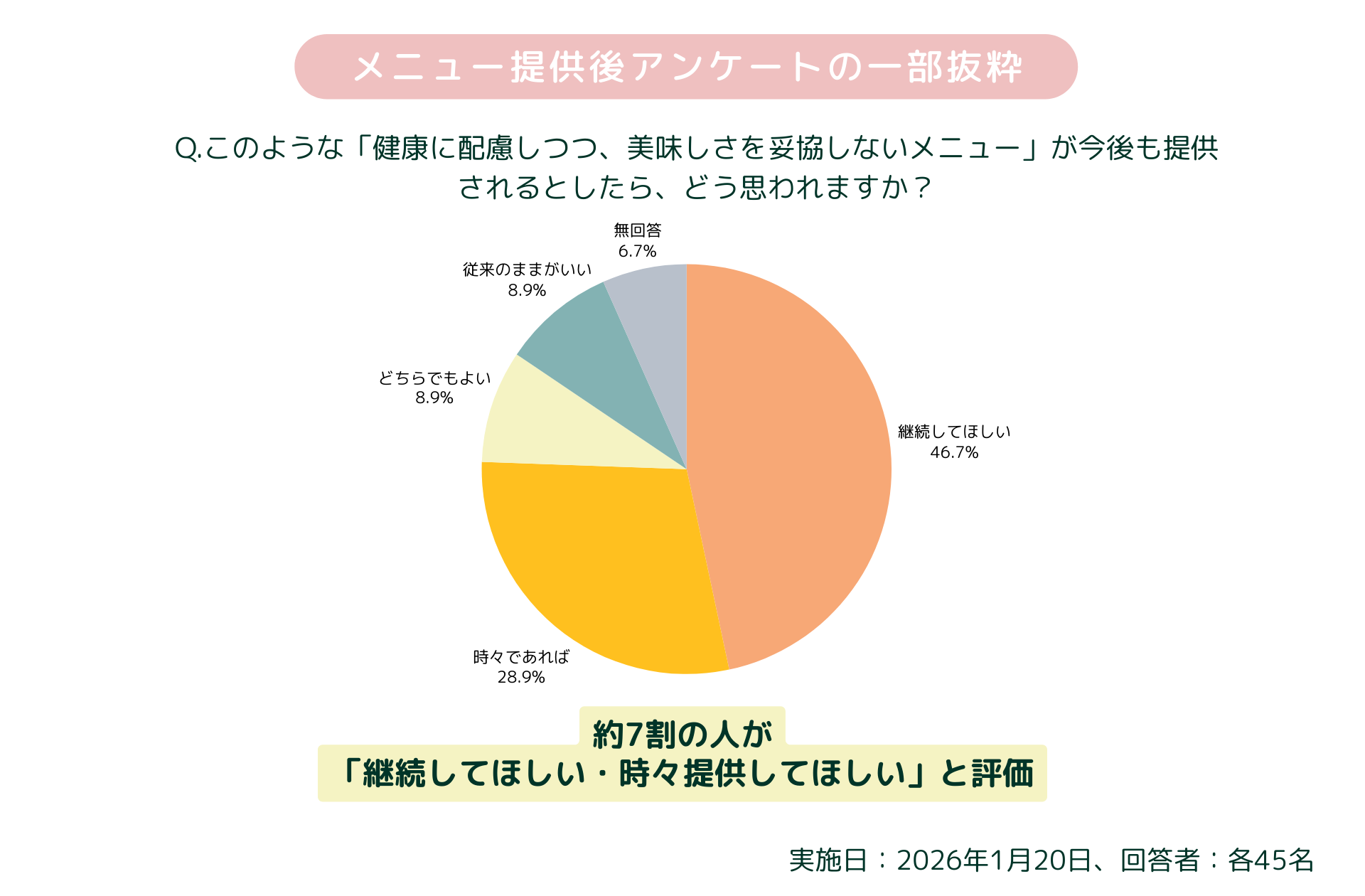 実食後のアンケートでは、零しおを使用したメニューに対し「満足」以上と回答した方が53.3%に達し、さらに今後もこうしたメニューを「継続・または時々提供してほしい」と回答した方は75.6%にのぼりました。